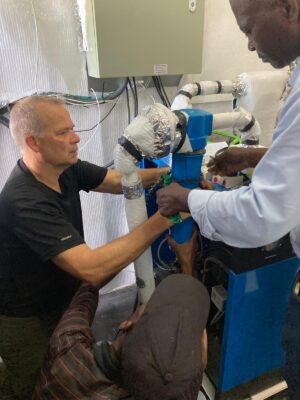 Hugh working with the team at HHA to change air filters for the O2 generator. |